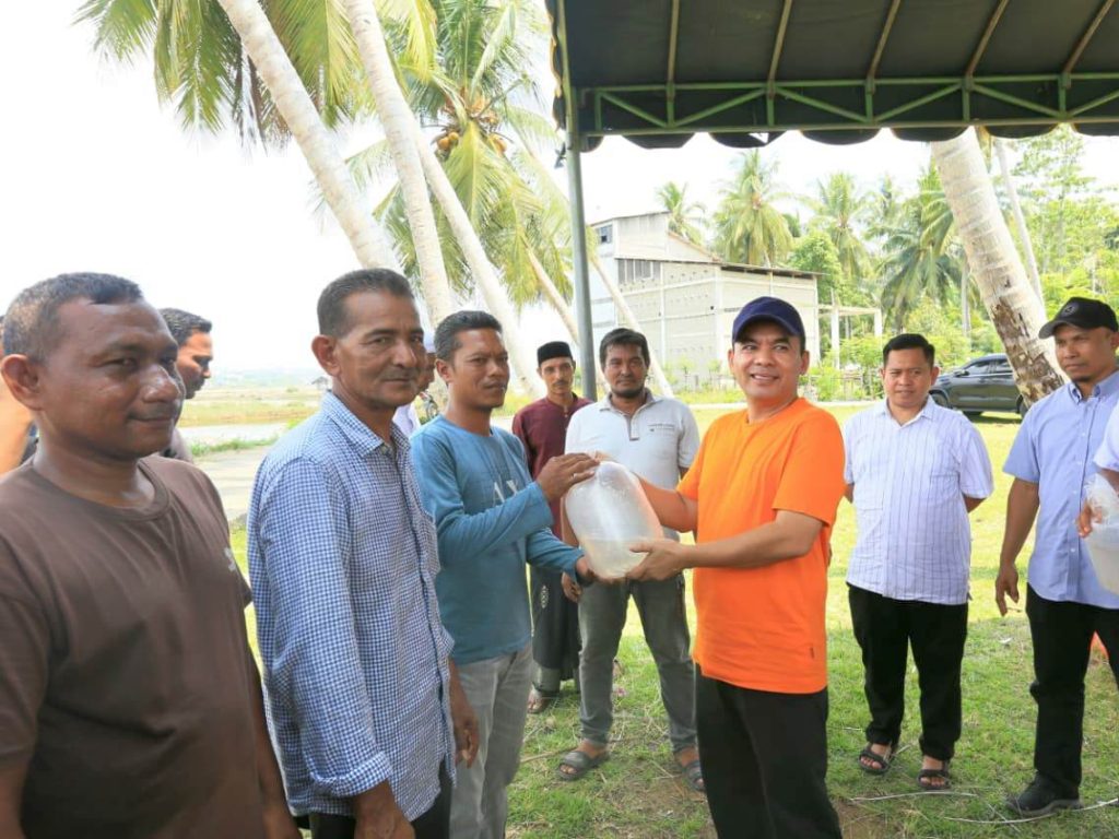 INFOLHOKSEUMAWE.com — Wali Kota Lhokseumawe, Sayuti Abubakar, menyerahkan bantuan 1.115.200 ekor benur udang vaname di Gampong Tunong, Kecamatan Blang Mangat, Sabtu (25/4/2026). Ia menyalurkan bantuan tersebut bersama Ketua Forikan Lhokseumawe kepada kelompok pembudidaya “Jak U Neuheun”.